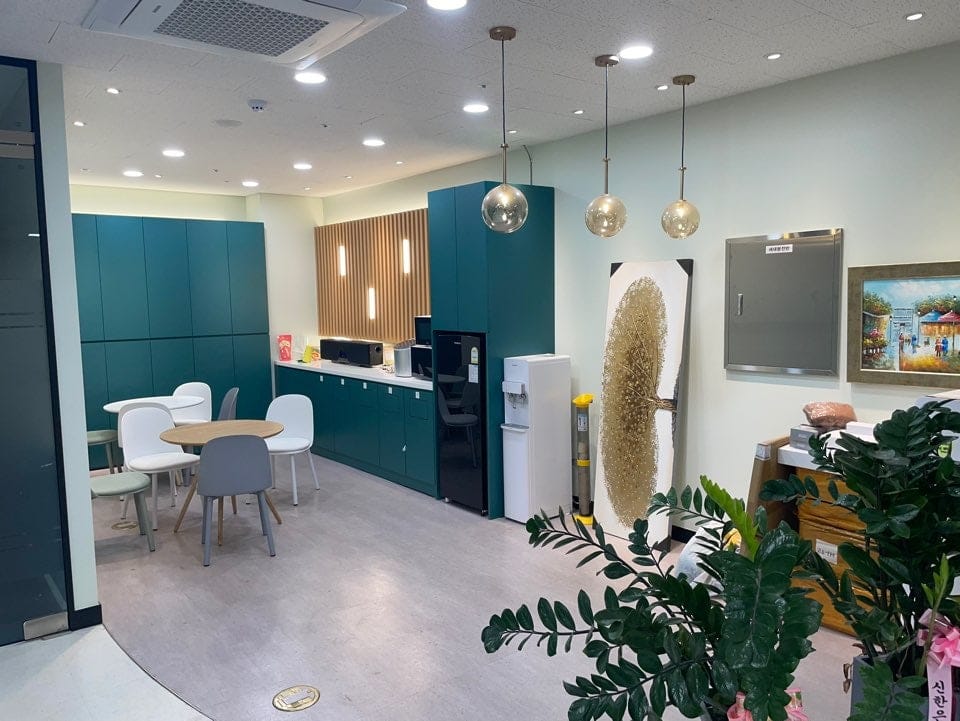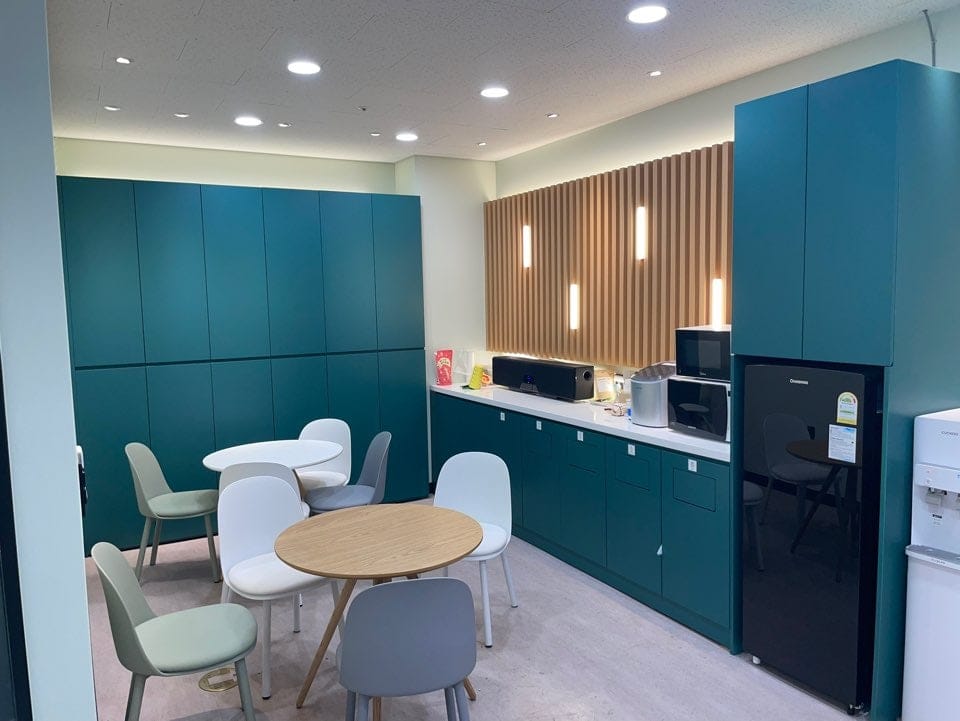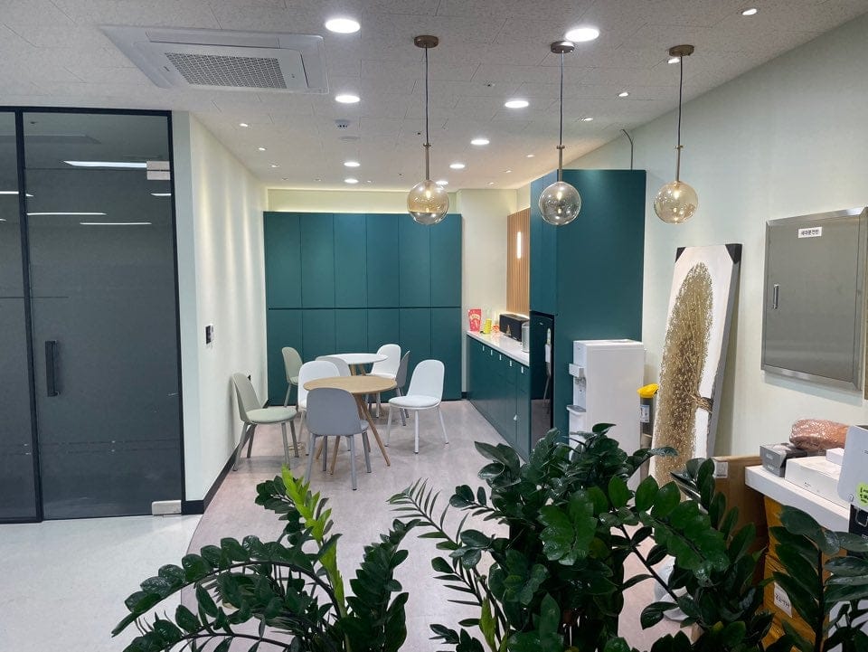 - 호텔 라운지급 카페테리아: 탕비실 사진을 보셨나요? 딥그린 & 우드 톤의 모던한 마감, 펜던트 조명까지. 직원들이 가장 좋아하는 휴게 공간이 이미 완성되어 있습니다.