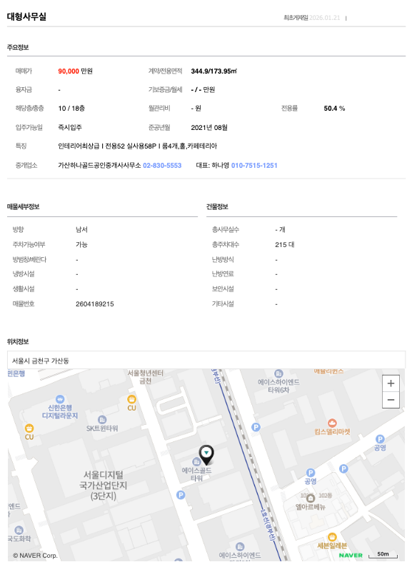가산 디지털단지에서 전용 20~30평대 매물은 많지만, 실사용 면적 50평 후반~60평대 의 단독 호실은 정말 드뭅니다. 두 호실을 터서 쓰자니 기둥이 거슬리고, 한 호실로는 좁았던 대표님들에게 전용 52평 + 발코니 확장 = 실사용 약 58평은 그야말로 '골든 사이즈'입니다.